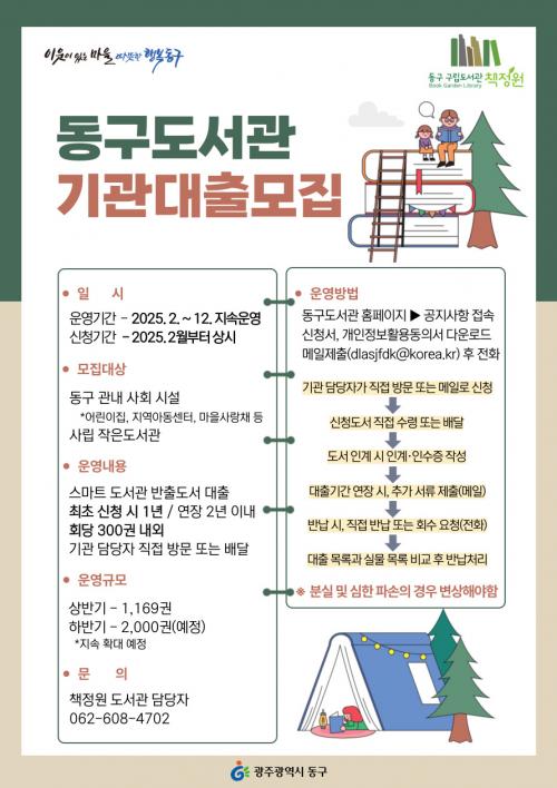 µ¿±¸´Â ¿ÃÇØ ÇϹݱâ 6~7°³¼Ò ±â°üÀ» ´ë»óÀ¸·Î 2õ¿© ±ÇÀ» ´ëÃâÇÒ °èȹÀÌ´Ù. ´ëÃâÀº ¿øÇÏ´Â ±â°üÀº µ¿±¸ µµ¼°ü ´©¸®Áý¿¡¼ °ü·Ã ¼·ù¸¦ ³»·Á¹Þ¾Æ ÀÛ¼º ÈÄ ´ã´çÀÚ À̸ÞÀÏ(dlasjfdk@korea.kr)·Î º¸³»¸é µÈ´Ù.
