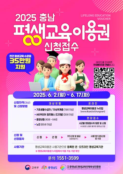 ½ÅûÀº Æò»ý±³À°ÀÌ¿ë±Ç ´©¸®Áý(https://www.lllcard.kr/reg/chungnam)À» ÅëÇØ ¿Â¶óÀÎÀ¸·Î Á¢¼öÇÒ ¼ö ÀÖÀ¸¸ç, ³ëÀÎ ´ë»óÀÚ´Â ½Ãû 5Ãþ Æò»ýÇнÀ»õ¸¶À»°ú¸¦ ¹æ¹®ÇØ ÇöÀå ½Åûµµ °¡´ÉÇÏ´Ù. ¼±Á¤µÈ ´ë»óÀÚ¿¡°Ô´Â 1ÀÎ´ç ¿¬°£ ÃÖ´ë 35¸¸ ¿øÀÇ Æò»ý±³À° °Áºñ¿Í ±³Àçºñ°¡ Áö¿øµÈ´Ù.