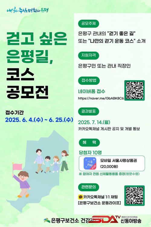 ½Åû ±â°£Àº 4ÀϺÎÅÍ ¿À´Â 25ÀϱîÁöÀ̸ç, ÀºÆò±¸¹ÎÀ̰ųª ÀºÆò±¸¿¡¼ ±Ù¹«ÇÏ´Â Á÷ÀåÀÎÀ̶ó¸é ´©±¸³ª °ø¸ðÀü¿¡ Âü¿©ÇÒ ¼ö ÀÖ´Ù. ½Åû ¹æ¹ýÀº ÁÖÁ¦¿¡ ¸Â°Ô ¾Ë·ÁÁÖ°í ½ÍÀº ¡®°È±â ÁÁÀº ±æ¡¯ ¶Ç´Â ¡®³ª¸¸ÀÇ °È±â ¿îµ¿ ÄÚ½º¡¯¿¡ ´ëÇÑ Á¤º¸¸¦ ³×À̹ö ÆûÀ¸·Î ÀÛ¼ºÇØ Á¦ÃâÇÏ¸é µÈ´Ù.