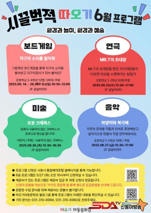 µû¿À±â¾Æµ¿¹®È°üÀº ¸Å¿ù ´Ù¸¥ ÁÖÁ¦¸¦ ¼±Á¤ÇØ ´Ù¾çÇÑ Ã¼ÇèÇü ¹®È ÇÁ·Î±×·¥À» ¿î¿µÇØ ¿À°í ÀÖÀ¸¸ç, 6¿ù¿¡´Â ¡®È¯°æ¡¯À» ÁÖÁ¦·Î ÇÑ º¸µå°ÔÀÓ, ¿¬±Ø³îÀÌ, À½¾Ç±Ø, ¹Ì¼ú³îÀÌ µîÀÌ ÁøÇàµÈ´Ù. ƯÈ÷ ¿¹¼ú³îÀÌ Áß½ÉÀÇ Á¢±ÙÀ» ÅëÇØ ¾ÆÀ̵éÀÌ ÀÚ¿¬½º·´°Ô ȯ°æ ¹®Á¦¿¡ °ü½ÉÀ» °¡Áú ¼ö ÀÖµµ·Ï ±¸¼ºÇß´Ù.