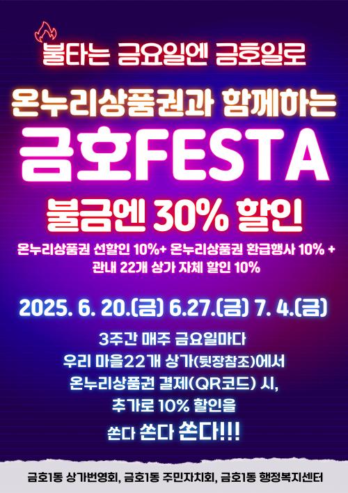 ±ÝÈ£1µ¿Àº ¡®ºÒŸ´Â ±Ý¿äÀÏ¿£ ±ÝÈ£Àϵ¿À¸·Î!¡¯À» ÁÖÁ¦·Î ¿À´Â 20ÀϺÎÅÍ 7¿ù 4ÀϱîÁö ¸ÅÁÖ ±Ý¿äÀÏ ¸ÔÀÚ°ñ¸ñ ÀÏ´ë¿¡¼ ÇÒÀÎ Çà»ç¸¦ ÁøÇàÇÑ´Ù. ÀÌ ±â°£ ¸ÔÀÚ°ñ¸ñ »ó°¡22°³¼Ò¿¡¼ µðÁöÅÐ ¿Â´©¸®»óǰ±ÇÀ» QR·Î °áÁ¦ÇÒ °æ¿ì ±âº»ÀûÀ¸·Î »óǰ±Ç ±¸ÀÔ ½Ã 10% ÇÒÀΰú »ç¿ë±Ý¾×ÀÇ 10% ȯ±Þ ÇýÅÃÀ» ¹Þ°í »ó°¡µéÀÇ ÀÚü ÇÒÀαîÁö ´õÇØÁ® ÃÖ´ë 30%ÀÇ ÇÒÀÎ ÇýÅÃÀ» ´©¸± ¼ö ÀÖ´Ù.