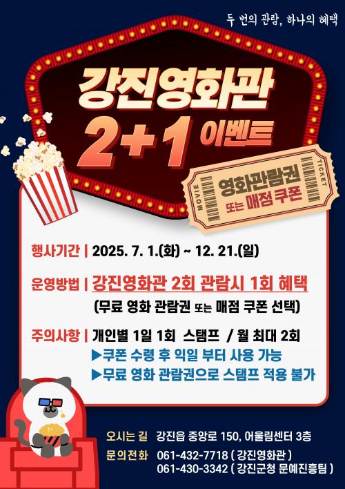 ¶ÇÇÑ °Áø±ºÀº 7¿ùºÎÅÍ ¡®2+1 À̺¥Æ®¡¯¸¦ ÅëÇØ ¿µÈ °ü¶÷ Àå·Á¿Í °ü°´ Âü¿© È®´ë¿¡µµ ³ª¼±´Ù. ÀÌ À̺¥Æ®´Â ¿µÈ 2ȸ °ü¶÷ ½Ã, ¹«·á ¿µÈ °ü¶÷±Ç ¶Ç´Â ¸ÅÁ¡ ÄíÆù Áß Çϳª¸¦ Á¦°øÇÏ´Â ÇÁ·Î±×·¥ÀÌ´Ù. 1ÀÎ 1ÀÏ 1ȸ¸¸ Àû¸³ °¡´ÉÇϸç, ¿ù ÃÖ´ë 2ȸ±îÁö ÇýÅÃÀ» ¹ÞÀ» ¼ö ÀÖ´Ù.