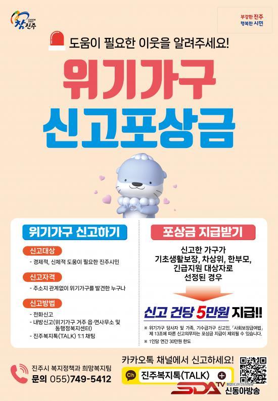 ¡®ÁøÁֽà À§±â°¡±¸ ½Å°íÆ÷»ó±Ý Á¦µµ¡¯´Â °æÁ¦Àû, ½ÅüÀû µµ¿òÀÌ ÇÊ¿äÇÑ ½Ã¹ÎÀ» ´ë»óÀ¸·Î À§±â°¡±¸ ¹ß°ß ½Å°í°¡ Á¢¼öµÇ¸é ½Ã´Â À¾¸éµ¿ »ó´ãÀ» ÅëÇØ ´ë»óÀÚ¿¡°Ô ÇÊ¿äÇÑ °ø°ø±Þ¿©³ª ¹Î°£¼ºñ½º µîÀ» ¿¬°è Áö¿øÇϰí, ¹ß±¼µÈ À§±â°¡±¸°¡ ±âÃÊ»ýȰº¸Àå¼ö±ÞÀÚ, Â÷»óÀ§°èÃþ, ÇѺθð°¡Á·, ±ä±ÞÁö¿ø´ë»óÀÚ·Î ¼±Á¤µÉ °æ¿ì ½Å°íÀÚ¿¡°Ô Æ÷»ó±Ý 5¸¸ ¿øÀ» Áö±ÞÇÑ´Ù. ´Ü, ½Å°íÀÚ°¡ ½Å°íµÈ À§±â°¡±¸ ´ç»çÀÚÀ̰ųª °¡Á· ¹× ģô, »çȸº¸Àå±Þ¿©¹ý¿¡ µû¸¥ ½Å°íÀǹ«ÀÚÀÏ °æ¿ì´Â Áö±ÞÀÌ Á¦ÇÑµÇ¸ç µ¿ÀÏ ½Å°íÀÎÀº ¿¬°£ ÃÖ´ë 30¸¸ ¿ø À̳»¿¡¼ Æ÷»ó±ÝÀ» Áö±Þ¹Þ°Ô µÈ´Ù.