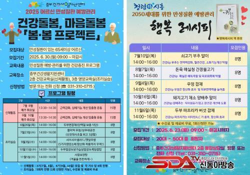 65¼¼ ÀÌ»ó ¾î¸£½Å ´ë»ó ¡®º½¤ýº½ ÇÁ·ÎÁ§Æ®¡¯´Â ±Ù·Â °È¿Í ½ÉÆó±â´É Çâ»óÀ» À§ÇÑ ½ÅüȰµ¿(7~10¿ù, ÁÖ 1ȸ)°ú, ¸¸¼ºÁúȯ ¿¹¹æÀ» À§ÇÑ Á¶¸®½Ç½À(6¿ù~11¿ù, ¿ù 1ȸ)À¸·Î ±¸¼ºµÈ´Ù. 20~50´ë ¼ºÀÎÀ» À§ÇÑ ¡®Çູ ·¹½ÃÇÇ¡¯´Â °Ç° ½ÄÀç·á¸¦ Ȱ¿ëÇÑ ¿ä¸®½Ç½À ÇÁ·Î±×·¥À¸·Î, 7¿ù~11¿ù Áß ¿ù 1ȸ ÃÑ 5ȸ ¿î¿µµÈ´Ù. ±³À°Àº Áߺΰǰ»ýȰÁö¿ø¼¾ÅÍ 2Ãþ °Ç°±³À°½Ç(½ÅüȰµ¿)°ú 3Ãþ ¿µ¾ç±³À°½Ç(Á¶¸®½Ç½À)¿¡¼ ÁøÇàµÈ´Ù.