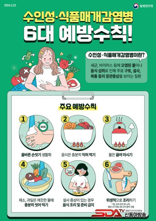 ¼öÀμº¡¤½Äǰ¸Å°³°¨¿°º´À» ¿¹¹æÇϱâ À§Çؼ´Â È帣´Â ¹°¿¡ 30ÃÊ ÀÌ»ó ºñ´©·Î ¼Õ¾Ä±â, À½½Ä ÃæºÐÈ÷ ÀÍÇô ¸Ô±â, ¹°Àº ²ú¿© ¸¶½Ã±â, ä¼Ò, °úÀÏÀº ±ú²ýÇÑ ¹°¿¡ ÃæºÐÈ÷ ¾Ä¾î¸Ô±â, ¼³»ç Áõ»óÀÌ ÀÖ´Â °æ¿ì À½½Ä Á¶¸® ¹× Áغñ ±ÝÁö, À§»ýÀûÀ¸·Î Á¶¸®Çϱ⠵î 6´ë ¿¹¹æ¼öÄ¢À» ÁؼöÇØ¾ß ÇÑ´Ù.