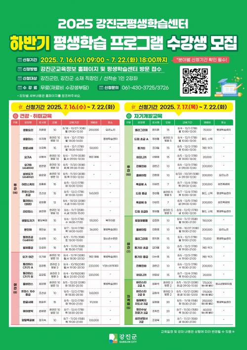 Æò»ýÇнÀ ¼ö° ½Åû¿¡ µû¸¥ ÀÚ¼¼ÇÑ »çÇ×Àº °Áø±º ȨÆäÀÌÁö(www.gangjin.go.kr) °í½Ã‧°ø°í ¶Ç´Â ±³À°Á¤º¸ ȨÆäÀÌÁö(Æò»ýÇнÀ-°Á½Åû)¸¦ Âü°íÇϰųª, Ãѹ«°ú ±³À°±³·ùÆÀ(061-430-3725)¿¡ ¹®ÀÇÇÏ¸é µÈ´Ù.