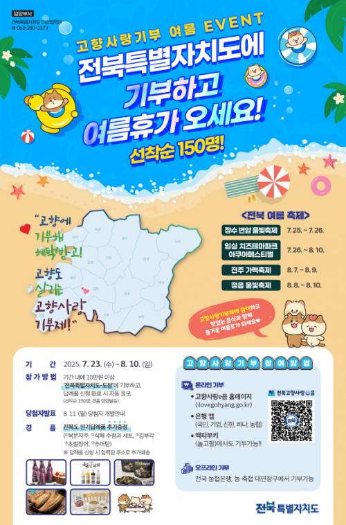 À̹ø À̺¥Æ®´Â ¡®ÀüºÏƯº°ÀÚÄ¡µµ-µµÃ»¡¯¿¡ 10¸¸ ¿ø ÀÌ»ó ±âºÎÇÑ »ç¶÷ Áß ¼±Âø¼ø 150¸íÀ» ´ë»óÀ¸·Î, ÀüºÏÀÌ ¾ö¼±ÇÑ Àα⠴ä·ÊǰÀ» Ãß°¡·Î Á¦°øÇÏ´Â Çà»ç´Ù. Áö±ÞµÇ´Â ¼±¹°Àº Ãß¾îÅÁ, ÃʹúÀå¾î µî ¿©¸§Ã¶ °Ç°À» À§ÇÑ Áö¿ª Ư»êǰÀ¸·Î ±¸¼ºµÇ¸ç, ¹«ÀÛÀ§·Î ¹ß¼ÛµÈ´Ù.