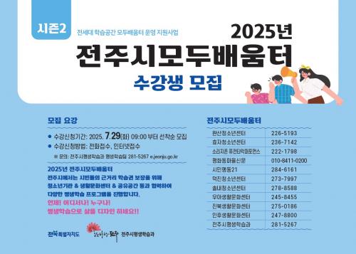 ¼ö°À» Èñ¸ÁÇÏ´Â ½Ã¹ÎÀº ÀüÁÖ½ÃÆò»ýÇнÀ°ü ´©¸®Áý(e.jeonju.go.kr)À» ÅëÇØ ¼±Âø¼ø ½ÅûÇÒ ¼ö ÀÖÀ¸¸ç, °¢ °Áº°·Î ÃÖ¼Ò ¸ðÁý Àοø(10¸í) ¹Ì´Þ ½Ã Æó°µÉ ¼ö ÀÖ´Ù.