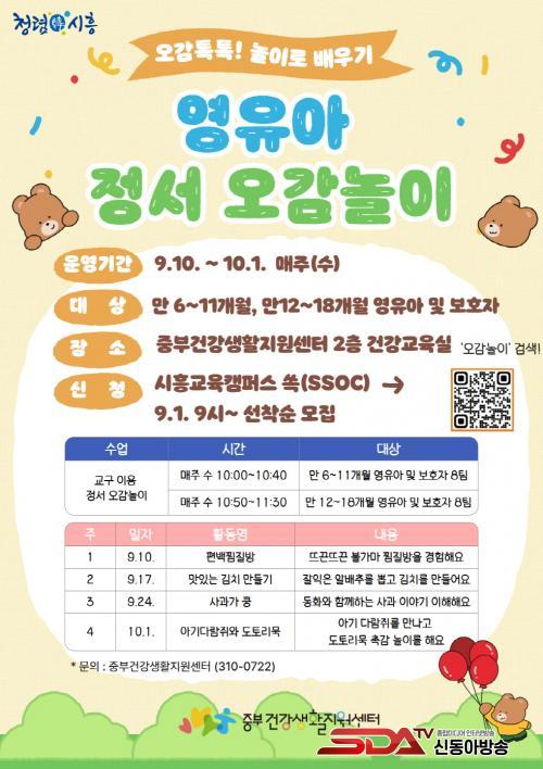 [½Åµ¿¾Æ¹æ¼Û ½ÃÈï½Ã=À̽ŵ¿±âÀÚ] ½ÃÈï½Ãº¸°Ç¼Ò Áߺΰǰ­»ýȰÁö¿ø¼¾ÅÍ(½ÃÀå ÀÓº´ÅÃ)´Â °ü³» ¿µÀ¯¾ÆÀÇ °Ç°­ÇÑ ¼ºÀå°ú ¹ß´ÞÀ» µ½±â À§ÇÑ ¡®¿À°¨ÅåÅå! ³îÀÌ·Î ¹è¿ì±â¡¯- ¿µÀ¯¾Æ Á¤¼­ ¿À°¨³îÀÌ ±³À°À» ¿À´Â 9¿ù 10ÀϺÎÅÍ 10¿ù 1ÀϱîÁö ¸ÅÁÖ ¼ö¿äÀÏ ÃÑ 4ȸ¿¡ °ÉÃÄ ¿î¿µÇÑ´Ù.