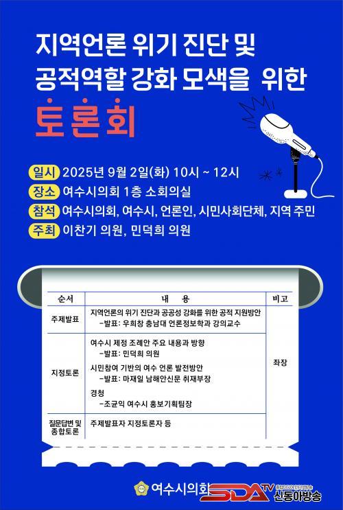 ¿©¼ö½ÃÀÇȸ, ¿À´Â 9¿ù 2ÀÏ ¡®Áö¿ª¾ð·Ð À§±âÁø´Ü°ú °øÀû¿ªÇÒ °­È­ Åä·Ðȸ¡¯ °³ÃÖ