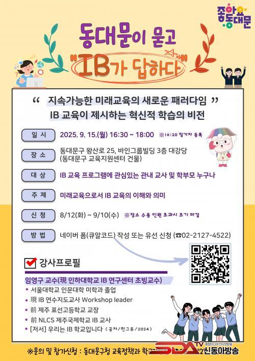 [½Åµ¿¾Æ¹æ¼Û µ¿´ë¹®±¸=À̽ŵ¿±âÀÚ] ¼­¿ï µ¿´ë¹®±¸´Â 9¿ù 15ÀÏ IB ±³À° ÇÁ·Î±×·¥¿¡ °ü½É ÀÖ´Â °ü³» ±³»ç ¹× Çкθ𸦠´ë»óÀ¸·Î ¡®µ¿´ë¹®ÀÌ ¹¯°í, IB°¡ ´äÇÏ´Ù¡¯ Ư°­À» °³ÃÖÇÑ´Ù.