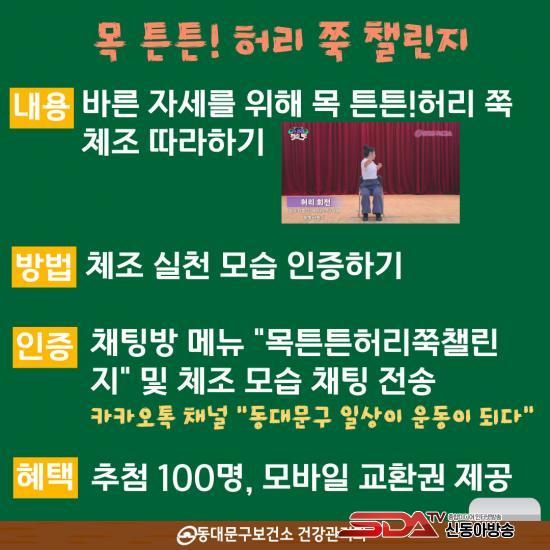À̹ø 縰Áö´Â °ü³» 4~18¼¼ ¾Æµ¿‧û¼Ò³âÀ» ´ë»óÀ¸·Î 9¿ù 1ÀϺÎÅÍ 14ÀϱîÁö 2ÁÖ°£ ÁøÇàµÈ´Ù. Âü¿© ¹æ¹ýÀº µ¿´ë¹®±¸º¸°Ç¼Ò°¡ °³¹ßÇÑ ¡®¸ñ ưư! Ç㸮 Âß! üÁ¶¡¯¸¦ µû¶ó ÇÑ ÀÎÁõ»çÁøÀ» īī¿ÀÅå ä³Î ¡®µ¿´ë¹®±¸ ÀÏ»óÀÌ ¿îµ¿ÀÌ µÇ´Ù¡¯ ³» ¡®¸ñ ưư! Ç㸮 Âß! 縰Áö¡¯ ¸Þ´º¿¡ ¾÷·ÎµåÇÏ¸é µÈ´Ù.