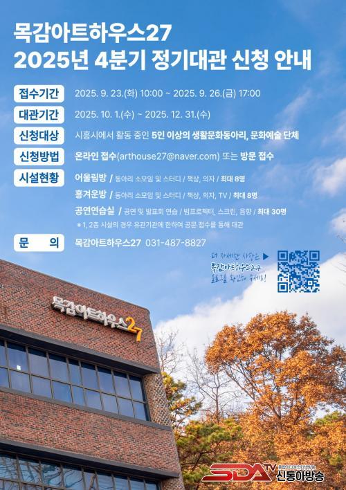 ½Åû ´ë»óÀº ¸ñ°¨¾ÆÆ®ÇϿ콺27¿¡¼ ½ÃÈï½Ã¿¡¼ Ȱµ¿ ÁßÀÎ »ýȰ¹®Èµ¿¾Æ¸®¿Í ¹®È¿¹¼ú ´Üü´Ù. ´ë°ü °¡´É °ø°£Àº µ¿¾Æ¸® ¼Ò¸ðÀÓ ¹× ½ºÅ͵ð·Î »ç¿ë °¡´ÉÇÑ 3Ãþ ¾î¿ï¸²¹æ°ú Èï°Ü¿î¹æ, °ø¿¬ ¹× ¹ßǥȸ ¿¬½ÀÀÌ °¡´ÉÇÑ 3Ãþ °ø¿¬¿¬½À½ÇÀ̸ç 1, 2ÃþÀÇ °æ¿ì À¯°ü±â°ü ¹× ´Üü °ø¹® ÇùÁ¶¿¡ ÀÇÇØ ´ë°üÀÌ °¡´ÉÇÏ´Ù. ½ÉÀǸ¦ °ÅÃÄ ¼±Á¤µÉ °æ¿ì 10¿ùºÎÅÍ 12¿ù±îÁö ÃÑ 3°³¿ù°£ ¸ñ°¨¾ÆÆ®ÇϿ콺27 °ø°£À» ÀÌ¿ëÇÒ ¼ö ÀÖ´Ù.
