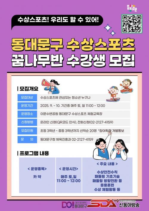 ¡¸¼ö»ó½ºÆ÷Ã÷ ²Þ³ª¹«¹Ý¡¹Àº Ä«¾à°ú SUP(Stand Up Paddleboard) µî ¼ö»ó½ºÆ÷Ã÷¸¦ Á÷Á¢ ¹è¿ì°í Áñ±æ ¼ö Àִ üÇèÇü ½ºÆ÷Ã÷ ÇÁ·Î±×·¥ÀÌ´Ù. Áö³­ 6¿ù 1ÀϺÎÅÍ ¿î¿µ ÁßÀÎ µ¿´ë¹®±¸ ¼ö»ó½ºÆ÷Ã÷üÇè±³À°Àå¿¡¼­ ÁøÇàµÇ¸ç ¼ö»ó ¾ÈÀü±³À°, Àü¹® °­»çÀÇ ´Ü°èº° Áöµµ¸¦ ÅëÇØ Âü°¡ÀÚµéÀÌ ¾ÈÀüÇÏ°Ô ½ºÆ÷Ã÷¸¦ Áñ±â¸é¼­ ½Ç·ÂÀ» ½×À» ¼ö ÀÖµµ·Ï ±¸¼ºµÆ´Ù.