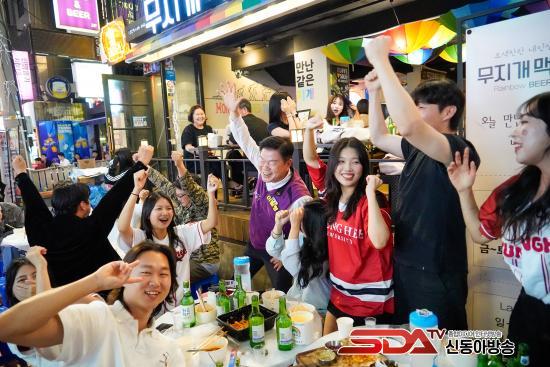 ÀÌÇÊÇü µ¿´ë¹®±¸Ã»Àå(º¸¶ó»ö Á¶³¢)ÀÌ ´ëÇлýµé°ú ÇÔ²² ÃàÁ¦¸¦ Áñ±â°í ÀÖ´Ù.