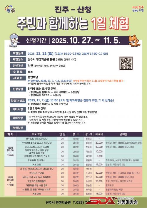 [½Åµ¿¾Æ¹æ¼Û °æ³²ÁøÁÖ=³²±Ã¿µ±â±âÀÚ] ÁøÁֽà Æò»ýÇнÀ°üÀº¡®ÁøÁÖ-»êû Áֹΰú ÇÔ²²ÇÏ´Â 1ÀÏ Ã¼Ç衯Âü°¡ÀÚ¸¦ 10¿ù 27ÀϺÎÅÍ 11¿ù 5ÀϱîÁö 10Àϰ£ ¸ðÁýÇÑ´Ù.