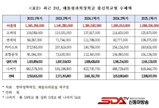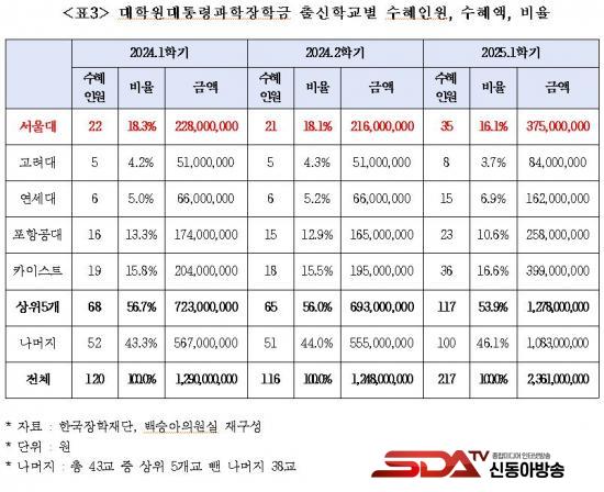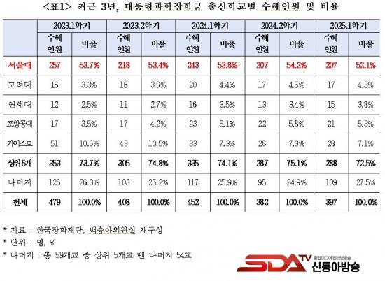 ¡à ±¹È¸ ±³À°À§¿øÈ¸ ¹é½Â¾Æ ÀÇ¿ø(´õºÒ¾î¹ÎÁÖ´ç)ÀÌ Çѱ¹ÀåÇÐÀç´ÜÀ¸·ÎºÎÅÍ Á¦Ãâ¹ÞÀº ¡®±¹°¡¿ì¼öÀåÇÐ±Ý ¼öÇý ÇöȲ¡¯ ÀÚ·á¿¡ µû¸£¸é, ¿ÃÇØ 1Çб⠴ëÅë·É°úÇÐÀåÇбÝÀ» ¹ÞÀº 397¸í Áß °ú¹ÝÀÎ 207¸í(52.1%)ÀÌ ¼­¿ï´ë»ýÀ̾ú´Ù. ¼­¿ï´ë ´ÙÀ½À¸·Î ¼öÇýÇлýÀÌ ¸¹Àº Ä«À̽ºÆ®(28¸í¡¤7.1%)º¸´Ù 179¸íÀ̳ª ¸¹¾Æ ¼­¿ï´ë·ÎÀÇ ÀåÇÐ±Ý ¼öÇý ½ò¸²ÀÌ Å« °ÍÀ¸·Î ³ªÅ¸³µ´Ù.