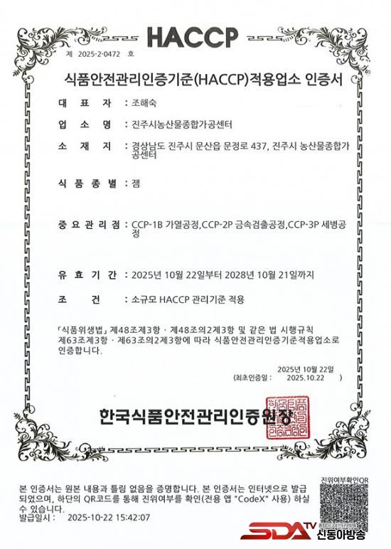 [½Åµ¿¾Æ¹æ¼Û °æ³²ÁøÁÖ=³²±Ã¿µ±â±âÀÚ] ÁøÁֽ𡠿ÇÏ´Â ³ó»ê¹°Á¾ÇÕ°¡°ø¼¾ÅͰ¡ ¡®½Äǰ¾ÈÀü°ü¸®ÀÎÁõ±âÁØ(HACCP)¡¯ ǰ¸ñÀ» È®´ëÇØ Áö¿ª ³ó¾÷ÀÎÀÇ °¡°ø¿ª·® °­È­¿Í °¡°øÇ° ¾ÈÀü¼º È®º¸¿¡ ³ª¼±´Ù.