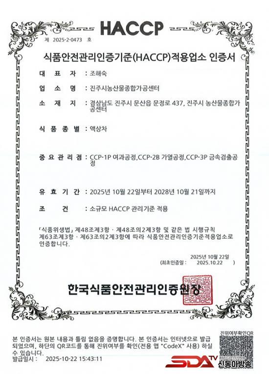 ÁøÁֽà ³ó»ê¹°Á¾ÇÕ°¡°ø¼¾ÅÍ´Â Áö¿ª³ó»ê¹°À» Ȱ¿ëÇØ °¡°øÁ¦Ç° °³¹ß°ú ³ó¾÷ÀÎÀÇ ¼ÒµæÃ¢ÃâÀ» µ½°í ÀÖÀ¸¸ç, Áö³­ÇØ 7¿ù °úäÁÖ½º·ù¿Í ĵµð·ù 2°³ À¯Çü¿¡ ´ëÇØ ¡®HACCP¡¯ ÀÎÁõÀ» ¹ÞÀº ÈÄ, ¿ÃÇØ 10¿ù 22ÀÏ Àë·ù¿Í ¾×»óÂ÷ 2°³ À¯ÇüÀ» Ãß°¡·Î ÀÎÁõ¹Þ¾Æ ³ó»ê¹°Á¾ÇÕ°¡°ø¼¾ÅÍ¿¡¼­ »ý»êµÇ´Â Á¦Ç°ÀÇ ¾ÈÀü¼º°ú ½Å·Úµµ¸¦ ÇÑÃþ ´õ ³ô¿´´Ù.