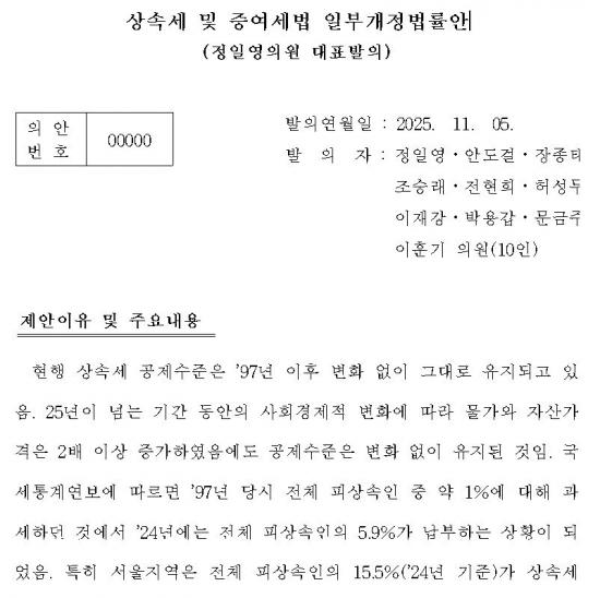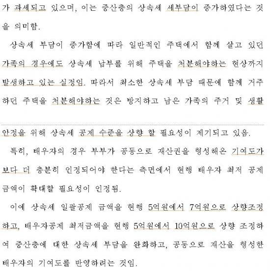 Á¤ÀÏ¿µ ÀÇ¿øÀº ¡°»ó¼Ó¼¼ ºÎ´ãÀ¸·Î °¡Á·ÀÌ ÇÔ²² »ì´ø ÁýÀ» ÀÒ´Â ÀÏÀº ¾ø¾î¾ß ÇÑ´Ù¡±¸ç,¡°Æ¯È÷ ¹è¿ìÀÚÀÇ Àç»ê Çü¼º ±â¿©µµ¸¦ ÃæºÐÈ÷ ÀÎÁ¤ÇØ Àϰý°øÁ¦ ±Ý¾×À» 5¾ï ¿ø¿¡¼­ 7¾ï ¿øÀ¸·Î, ¹è¿ìÀÚ°øÁ¦ ÃÖÀú±Ý¾×À» 5¾ï ¿ø¿¡¼­ 10¾ï ¿øÀ¸·Î »óÇâÇÔÀ¸·Î½á Áß»êÃþÀÇ »ó¼Ó¼¼ ºÎ´ãÀ» ¿ÏÈ­ÇÏ°í °¡Á·ÀÇ ÁְžÈÁ¤À» º¸ÀåÇϰíÀÚ ÇÑ´Ù¡±°í ÀüÇß´Ù.