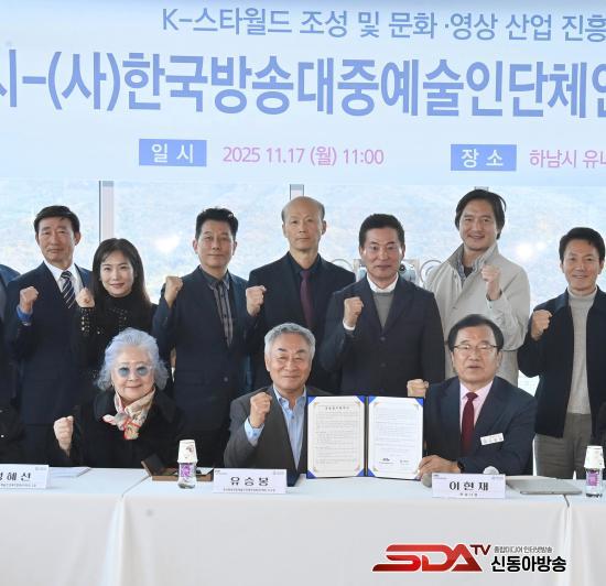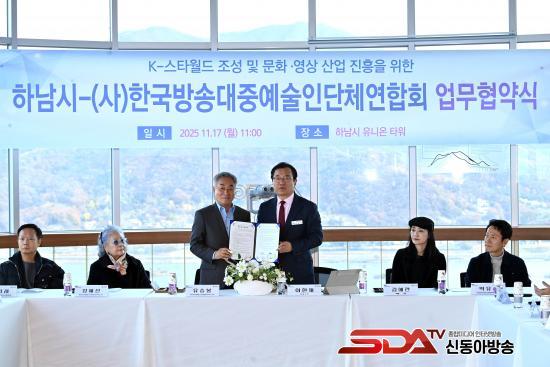 11¿ù 17ÀÏ Çϳ²½Ã À¯´Ï¿ÂŸ¿ö¿¡¼­ ÀÌÇöÀç Çϳ²½ÃÀå(¿À¸¥ÂÊ)°ú À¯½ÂºÀ Çѱ¹¹æ¼Û´ëÁß¿¹¼úÀδÜü¿¬ÇÕȸ ÀÌ»çÀå(°¡¿îµ¥), Á¤Çý¼± ¿¬ÇÕȸ °í¹®(¿ÞÂÊ)À» ºñ·ÔÇÑ ¹æ¼Û¡¤´ëÁß¿¹¼ú ºÐ¾ß 5°³ ´Üü¸¦ ´ëÇ¥ÇÏ´Â ÀÓ¿øµéÀÌ k-½ºÅ¸¿ùµå Á¶¼º ¹× ¹®È­‧¿µ»ó »ê¾÷ ÁøÈïÀ» À§ÇÑ ¾÷¹«Çù¾àÀ» ü°áÇÑ ÈÄ ±â³äÃÔ¿µÀ» Çϰí ÀÖ´Ù.