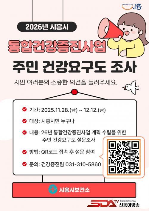 [½Åµ¿¾Æ¹æ¼Û ½ÃÈï½Ã=À̽ŵ¿±âÀÚ] ½ÃÈï½Ã´Â 2026³â Áö¿ª»çȸ ÅëÇհǰ­ÁõÁø»ç¾÷ °èȹ ¼ö¸³À» À§ÇØ ¿À´Â 12¿ù 12ÀϱîÁö Áö¿ª ÁÖ¹ÎÀ» ´ë»óÀ¸·Î º¸°ÇÀÇ·á¼­ºñ½º Àü¹Ý¿¡ °üÇÑ ÁֹΠ°Ç°­¿ä±¸µµ Á¶»ç¸¦ ½Ç½ÃÇÑ´Ù.