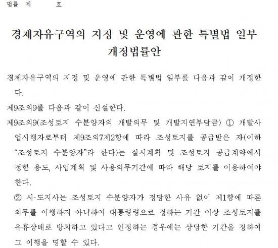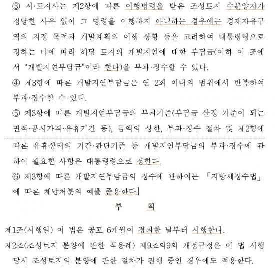 ÀÌ¿¡, Á¤ÀÏ¿µ ÀÇ¿øÀº À̹ø °³Á¤¾È¿¡ ¡ã°æÁ¦ÀÚÀ¯±¸¿ª ³» Á¶¼ºÅäÁö¸¦ ºÐ¾ç¹ÞÀº ÀÚ¿¡°Ô °èȹµÈ ¿ëµµ¿Í Á¤ÇØÁø »ç¿ë ±â°£¿¡ µû¶ó ÅäÁö¸¦ ÀÌ¿ëÇÒ ¹ýÀû Àǹ«¸¦ ¸íÈ®È÷ ºÎ¿©Çϰí, ¡ãÁ¤´çÇÑ »çÀ¯ ¾øÀÌ °³¹ßÀÌ Áö¿¬µÇ°Å³ª À¯ÈÞ »óÅ·Π¹æÄ¡µÉ °æ¿ì ½Ã¡¤µµÁö»ç°¡ ÀÌÇà¸í·ÉÀ» ³»¸° µÚ °³¹ßÁö¿¬ºÎ´ã±ÝÀ» ¿¬ 2ȸ ¹Ýº¹ ºÎ°úÇÒ ¼ö ÀÖµµ·Ï ÇÏ´Â ±Ù°Ü ±ÔÁ¤À» ½Å¼³ÇÏ´Â ³»¿ëÀ» ´ã¾Ò´Ù.