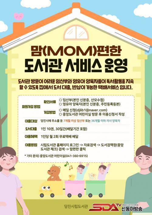 ¡®¸¾(MOM)ÆíÇÑ µµ¼°ü ÅÃ¹è ¼ºñ½º¡¯´Â ´çÁø½Ã¿¡ °ÅÁÖÇÏ´Â 7°³¿ù ÀÌ»ó ÀÓ»êºÎ¿Í 36°³¿ù ÀÌÇÏ ¿µÀ¯¾Æ ¾çÀ°ÀÚ¸¦ ´ë»óÀ¸·Î ÇÑ´Ù. µµ¼°ü ȸ¿øÁõ ¼ÒÁöÀÚ¶ó¸é ´©±¸³ª Áß¾Óµµ¼°ü ¾î¸°À̽ÇÀ» ¹æ¹®Çϰųª ȨÆäÀÌÁö¿¡¼ ½Åû¼¸¦ ³»·Á¹Þ¾Æ ÀüÀÚ¿ìÆí(djlib1@naver.com)À¸·Î Á¦Ãâ ÈÄ ÀÌ¿ëÇÒ ¼ö ÀÖ´Ù.