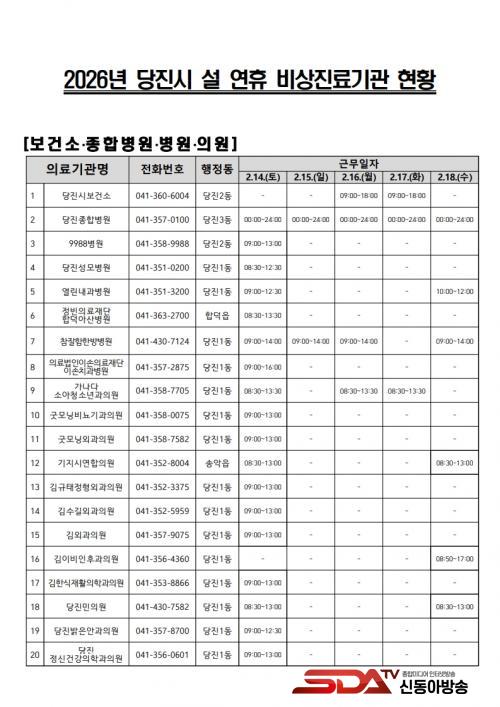 ÇÑÆí, ´çÁø½Ãº¸°Ç¼Ò´Â 2¿ù 16Àϰú 17ÀÏ(¿ÀÀü 9½Ã~¿ÀÈÄ 6½Ã) Áø·á½ÇÀ» ¿î¿µÇϸç, ¿¬ÈÞ Àü ±â°£ Àç³ ¹× ´Ù¼ö »ç»óÀÚ ¹ß»ý »óȲ¿¡ ´ëºñÇØ ¡®ÀÀ±ÞÀÇ·áÁö¿ø¹Ý¡¯À» Æí¼ºÇÏ¿© Áï°¢ÀûÀÎ ´ëÀÀ ü°è¸¦ °¡µ¿ÇÑ´Ù.