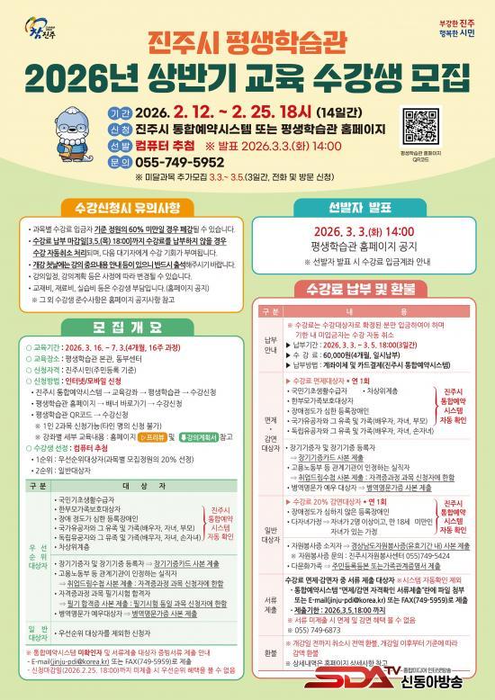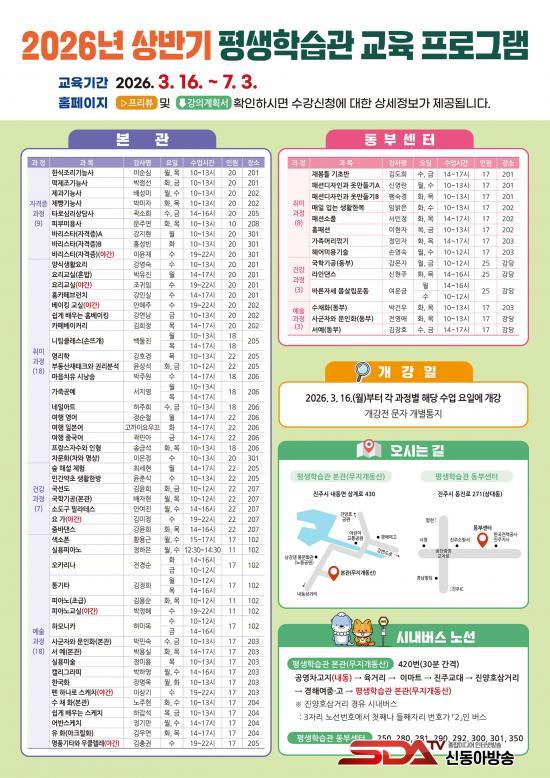 [½Åµ¿¾Æ¹æ¼Û °æ³²ÁøÁÖ=³²±Ã¿µ±â±âÀÚ] ÁøÁֽà Æò»ýÇнÀ°üÀº ½Ã¹ÎµéÀÇ Áö¼ÓÀûÀÎ ÇнÀ°ú ¼ºÀåÀ» Áö¿øÇϱâ À§ÇØ 2¿ù 12ÀϺÎÅÍ 25ÀϱîÁö 14Àϰ£ 2026³â »ó¹Ý±â Á¤±â±³À° ¼ö°­»ý 1,234¸íÀ» ¸ðÁýÇÑ´Ù.