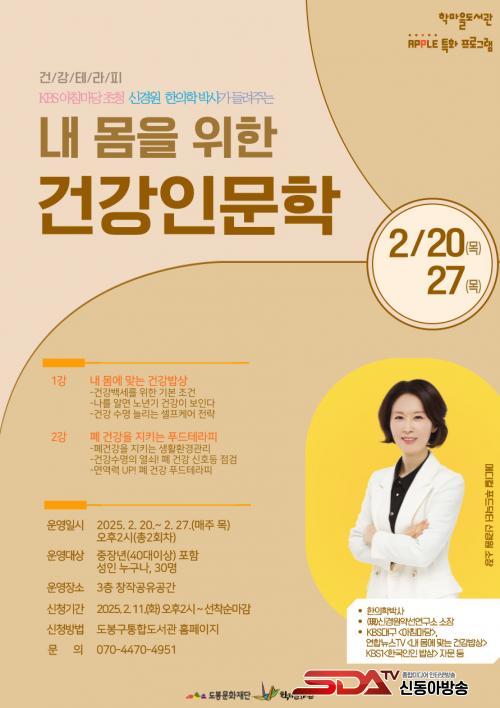 [½Åµ¿¾Æ¹æ¼Û µµºÀ±¸=À̽ŵ¿±âÀÚ] µµºÀ±¸ Çи¶À»µµ¼­°üÀÌ ¿À´Â 2¿ù 20Àϰú 27ÀÏ µÎ ¹ø¿¡ °ÉÃÄ ¡®³» ¸öÀ» À§ÇÑ °Ç°­Àι®ÇС¯ °­¿¬À» °³ÃÖÇÑ´Ù. °­¿¬¿¡´Â ½Å°æ¿ø¾à¼±¿¬±¸¼Ò ½Å°æ¿ø ¼ÒÀåÀÌ ³ª¼±´Ù.