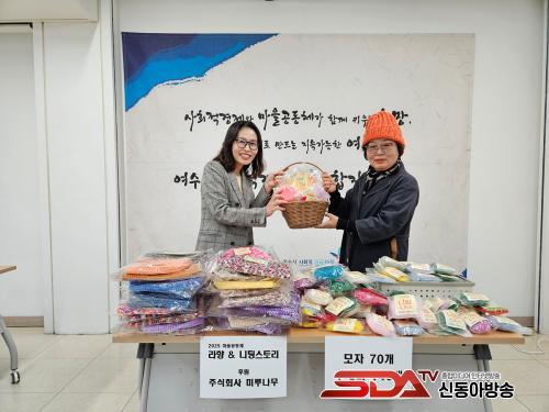 µÎ °øµ¿Ã¼ ȸ¿øµéÀº Áö¿ª ¾î¸£½Åµé¿¡°Ô Àü´ÞÇÒ ¼Õ¶ß°³ ¸ðÀÚ 70°³¿Í ¼ö¼¼¹Ì 140°³¸¦ Á¦ÀÛÇØ ¿©¼ö»çȸÀû°æÁ¦¸¶À»ÅëÇÕÁö¿ø¼¾ÅÍ¿¡ ±âºÎÇß´Ù. ¼¾ÅÍ´Â ±âºÎ¹ÞÀº ¹°Ç°À» ³ëÀÎÁÖ°£º¸È£¼¾Å͸¦ ¿î¿µ ÁßÀÎ »çȸÀû±â¾÷ ¢ß¹Ì·ç³ª¹«¿¡ Àü´ÞÇß´Ù.