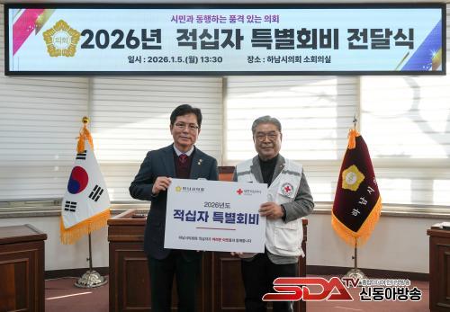 Çϳ²½ÃÀÇȸ ±Ý±¤¿¬ ÀÇÀå(»çÁø ¿ÞÂÊ)ÀÌ 1¿ù 5ÀÏ ÀÌÀçÁ¤ ´ëÇÑÀû½ÊÀÚ»ç °æ±âµµÁö»ç ȸÀå¿¡°Ô ¡®2026³â ´ëÇÑÀû½ÊÀÚ Æ¯º°È¸ºñ¡¯¸¦ Àü´ÞÇÏ°í ±â³äÃÔ¿µÀ» Çϰí ÀÖ´Ù. (»çÁø_Çϳ²½ÃÀÇȸ Á¦°ø)
