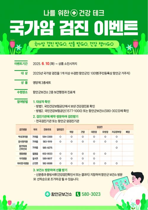 [½Åµ¿¾Æ¹æ¼Û °æ³²ÇÔ¾È=À̽ŵ¿±âÀÚ] ÇԾȱºº¸°Ç¼Ò´Â 6¿ù 10ÀϺÎÅÍ »óǰ¼ÒÁø½Ã±îÁö, 2025³â ±¹°¡¾Ï °ËÁø ¼ö°ËÀÚ¸¦ ´ë»óÀ¸·Î ¡®³ª¸¦ À§ÇÑ °Ç°­Å×Å©, ±¹°¡¾Ï °ËÁø¡¯ À̺¥Æ®¸¦ ½Ç½ÃÇÑ´Ù°í ¹àÇû´Ù. ÇØ´ç À̺¥Æ® Âü¿©¹æ¹ýÀº ±¹°¡¾Ï °ËÁø 6°³(À§¾Ï, °£¾Ï, ´ëÀå¾Ï, À¯¹æ¾Ï, ÀÚ¡¦