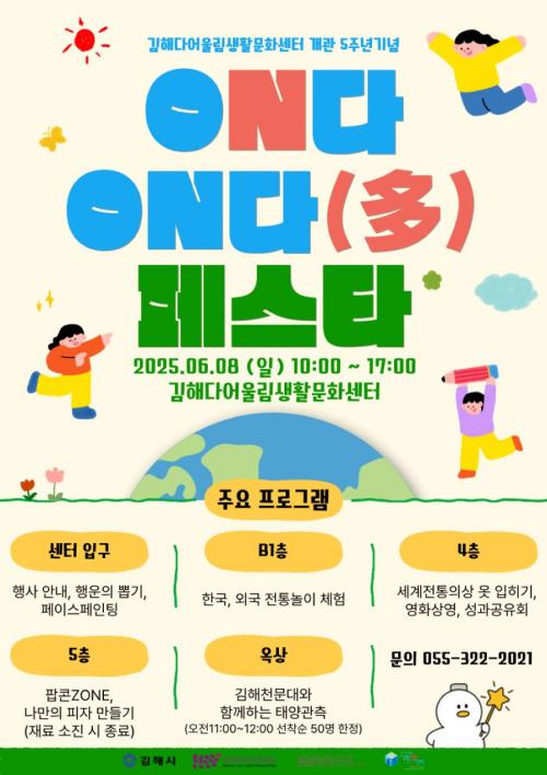 [½Åµ¿¾Æ¹æ¼Û °æ³²±èÇØ=³²±Ã¿µ±â±âÀÚ] (Àç)±èÇØ¹®È­°ü±¤Àç´Ü ±èÇØ´Ù¾î¿ï¸²»ýȰ¹®È­¼¾ÅÍ´Â ¿À´Â 8ÀÏ ¼­»óµ¿ ¼¾ÅÍ ³»¿¡¼­ °³°ü 5Áֳ⠱â³ä ¸¦ °³ÃÖÇÑ´Ù. ´Â ´©±¸µç ´Ù¾î¿ï¸²»ýȰ¹®È­¼¾Å͸¦ ¹æ¹®Çϸé Çà»ç¸¦ Áñ±æ ¼ö ÀÖ´Ù¡¦