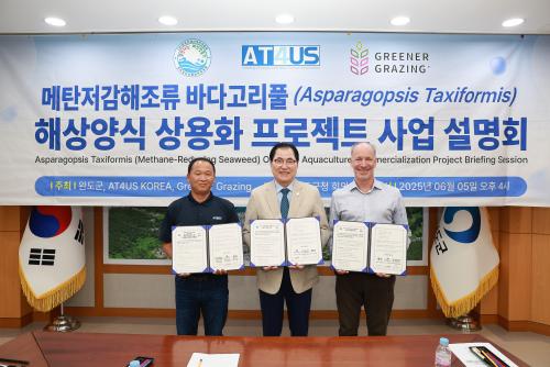 [½Åµ¿¾Æ¹æ¼Û ¿Ïµµ=À̼±Á¾ ±âÀÚ] ¿Ïµµ±ºÀº Áö³­ 6¿ù 5ÀÏ ÇØ¾ç ºí·çÅ×Å© ½ºÅ¸Æ®¾÷ AT4US Korea(´ëÇ¥ À̹οµ, ±¸ ·¹µå¾¾À§µå·¦½º ÄÚ¸®¾Æ)¿Í ±Û·Î¹ú ¹Ù´Ù°í¸®Ç® ¿¬±¸ ±â¾÷ Greener Grazing LLC(´ëÇ¥ÀÌ»ç Josh Goldman)¿Í ÅäÁ¾ ¹Ù´Ù°í¸®Ç®(Asparagopsis taxiformis)À» ¡¦