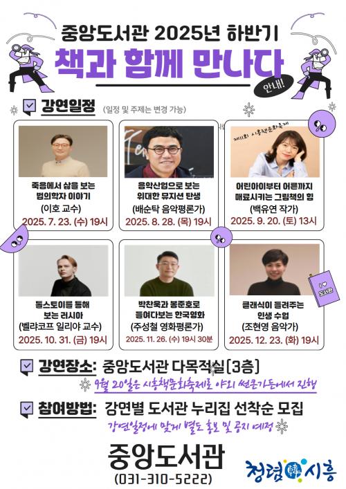 [½Åµ¿¾Æ¹æ¼Û ½ÃÈï½Ã=À̽ŵ¿±âÀÚ] ½ÃÈï½Ã Áß¾Óµµ¼­°üÀº ¸Å¿ù ´Ù¾çÇÑ ºÐ¾ßÀÇ ÀúÀÚ¸¦ ÃÊÃ»ÇØ ÁøÇàÇÏ´Â Àι®ÇÐ °­¿¬, ¡®Ã¥°ú ÇÔ²² ¸¸³ª´Ù¡¯ÀÇ ÇϹݱâ ÀÛ°¡ Ã⿬ÁøÀ» °ø°³Çß´Ù. ¸ÕÀú ¿À´Â 7¿ù 23ÀÏ Àú³á 7½Ã¿¡´Â ÀüºÏ´ëÇб³ Àǰú´ëÇÐ ±³¼öÀÌÀÚ ¹ýÀÇÇÐÀÚÀÎ ÀÌÈ£ ±³¼ö¸¦ ¡¦