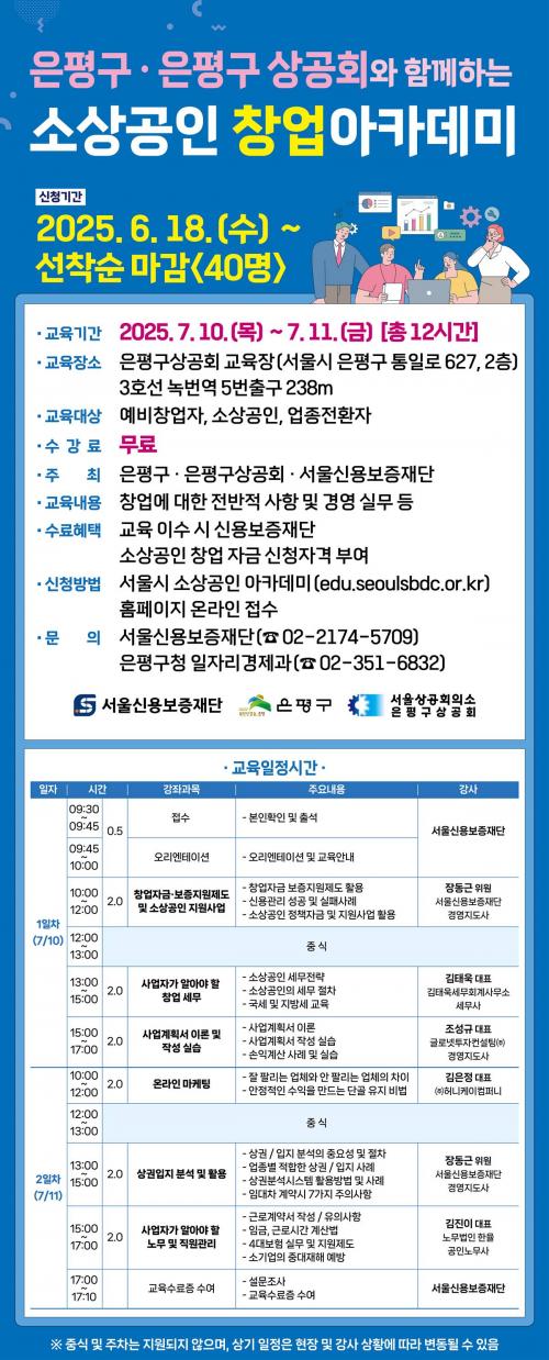 [½Åµ¿¾Æ¹æ¼Û ÀºÆò±¸=À̽ŵ¿±âÀÚ] ¼­¿ï ÀºÆò±¸´Â ¿À´Â 18ÀϺÎÅÍ ¿¹ºñ â¾÷ÀÚ, ¼Ò»ó°øÀÎ, ¾÷Á¾ ÀüȯÀÚ¸¦ ´ë»óÀ¸·Î ¡®2025³â ¼Ò»ó°øÀΠâ¾÷¾ÆÄ«µ¥¹Ì¡¯ ½ÅûÀ» ¹Þ´Â´Ù°í ¹àÇû´Ù. ½ÅûÀº ¼­¿ï½Ã ¼Ò»ó°øÀÎ ¾ÆÄ«µ¥¹Ì ȨÆäÀÌÁö¸¦ ÅëÇØ °¡´ÉÇϸç, ¼±Âø¼ø 40¸íÀÌ´Ù. ¼±Á¤µÈ ±³À°¡¦