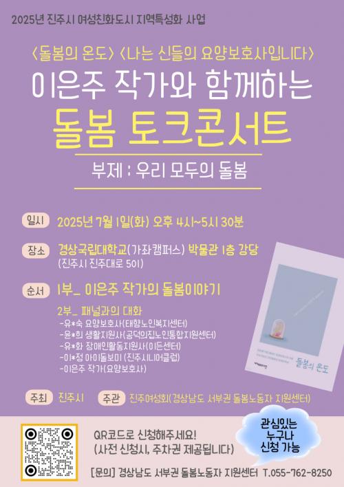 [½Åµ¿¾Æ¹æ¼Û °æ³²ÁøÁÖ=³²±Ã¿µ±â±âÀÚ] ÁøÁֽô ¿©¼ºÄ£È­µµ½Ã Áö¿ªÆ¯¼ºÈ­ »ç¾÷ÀÇ Çϳª·Î ¿À´Â 7¿ù 1ÀÏ ¿ÀÈÄ 4½Ã, °æ»ó±¹¸³´ëÇб³ ¹Ú¹°°ü 1Ãþ °­´ç¿¡¼­ ¡®ÀÌÀºÁÖ ÀÛ°¡¿Í ÇÔ²²ÇÏ´Â µ¹º½ ÅäÅ©Äܼ­Æ®¡¯¸¦ °³ÃÖÇÑ´Ù. À̹ø Çà»ç´Â ÁøÁֽà ¿©¼ºÄ£È­µµ½Ã Áö¿ªÆ¯¼ºÈ­ °ø¸ð»ç¾÷¡¦