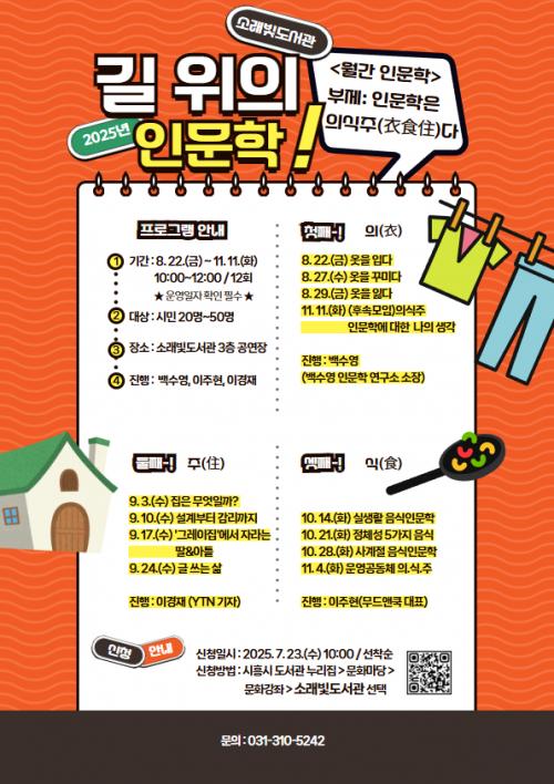 [½Åµ¿¾Æ¹æ¼Û ½ÃÈï½Ã=À̽ŵ¿±âÀÚ] ½ÃÈï½Ã ¼Ò·¡ºûµµ¼­°üÀÌ ¹®È­Ã¼À°°ü±¤ºÎ°¡ ÁÖÃÖÇϰí Çѱ¹¹®È­¿¹¼úÀ§¿øÈ¸°¡ ÁÖ°üÇÏ´Â ¡®2025³â ±æ À§ÀÇ Àι®ÇС¯ °ø¸ð»ç¾÷¿¡ ¼±Á¤µÅ ¿À´Â 8¿ù 22ÀϺÎÅÍ 11¿ù 11ÀϱîÁö ÃÑ 12ȸ¿¡ °ÉÃÄ Àι®ÇÐ ÇÁ·Î±×·¥ ¡®¿ù°£ Àι®ÇÐ: Àι®ÇÐÀº ÀǽÄÁÖ(ëýãÝ¡¦