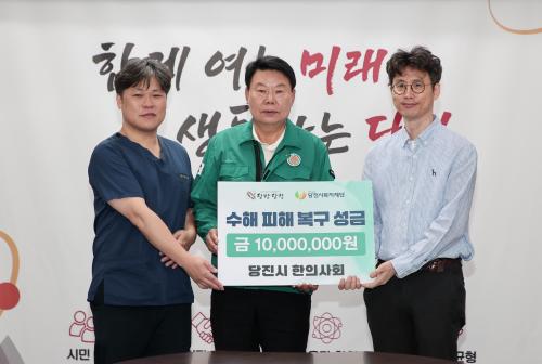 [½Åµ¿¾Æ¹æ¼Û=ÀÌÀçö±âÀÚ] ´çÁø½Ã ÇÑÀÇ»çµéÀÌ ¼öÇØ ÇÇÇØ·Î ¾î·Á¿òÀ» °Þ°í ÀÖ´Â ÀÌ¿ôµéÀ» À§ÇØ ¿ÂÁ¤À» ÀüÇß´Ù. 7¿ù 31ÀÏ ¿ÀÀü, ´çÁø½Ãû 7Ãþ Á¢°ß½Ç¿¡¼­ ´çÁø½Ã ÇÑÀÇ»çȸ(ȸÀå ±èÇö±â)´Â Áö¿ª ³» ÇÑÀÇ¿øµéÀÌ ÀÚ¹ßÀûÀ¸·Î ¸ð±ÝÇÑ ¼öÇØ º¹±¸ ¼º±Ý 1000¸¸ ¿øÀ» ±âŹÇß´Ù. ¡¦