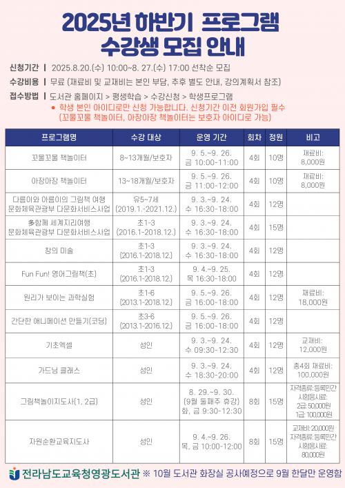 [½Åµ¿¾Æ¹æ¼Û Àü³²¿µ±¤=À̽ŵ¿±âÀÚ] Àü¶ó³²µµ±³À°Ã»¿µ±¤µµ¼­°üÀº À¯¾ÆºÎÅÍ Çлý, ¼ºÀÎÀ» ´ë»óÀ¸·Î 8¿ù 27ÀϱîÁö ÇϹݱ⠵µ¼­°ü ÇÁ·Î±×·¥ ¼ö°­»ýÀ» ¸ðÁýÇÑ´Ù. ¿î¿µ °úÁ¤Àº Å©°Ô À¯¾Æ¿Í ºÎ¸ð¸¦ À§ÇÑ ¡®¿µÀ¯¾Æ Ã¥³îÀÌÅÍ¡¯ µî 3°³ °­ÁÂ, ÃʵîÇлý ´ë»ó ¡®¿ø¸®°¡ º¸ÀÌ´Â ¡¦