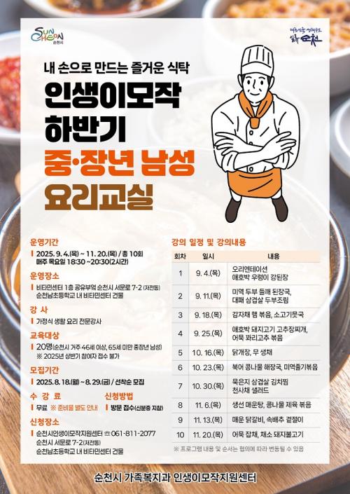 [½Åµ¿¾Æ¹æ¼Û ¼øÃµ=±è¿ëÈÆ ±âÀÚ] ¼øÃµ½Ã(½ÃÀå ³ë°ü±Ô)´Â ¿À´Â 9¿ù 4ÀϺÎÅÍ 11¿ù 20ÀϱîÁö 3°³¿ù°£ ¼øÃµ½Ã °ÅÁÖ Áß¡¤Àå³â ³²¼º(46¼¼ ÀÌ»ó 65¼¼ ¹Ì¸¸) 20¸íÀ» ´ë»óÀ¸·Î ¸ÅÁÖ ¸ñ¿äÀÏ Àú³á 18:30ºÎÅÍ 20:30±îÁö 1ȸ 2½Ã°£, 10ȸ±â °úÁ¤À¸·Î ³²¼º ¿ä¸® ±³½ÇÀ» ¿î¿µÇÑ´Ù. Áß¡¦
