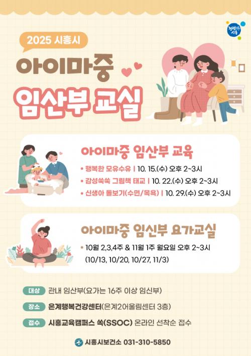 [½Åµ¿¾Æ¹æ¼Û ½ÃÈï½Ã=À̽ŵ¿±âÀÚ] ½ÃÈï½Ã(½ÃÀå ÀÓº´ÅÃ)´Â Áö¿ª ³» ÀÓ»êºÎÀÇ °Ç°­ÇÑ Ãâ»ê°ú À°¾Æ Áغñ¸¦ µ½±â À§ÇØ ¡®¾ÆÀ̸¶Áß¡¯ ÀÓ»êºÎ ±³½ÇÀ» ¿À´Â 10¿ù 13ÀϺÎÅÍ 11¿ù 3ÀϱîÁö Àº°èÇູ°Ç°­¼¾ÅÍÀÇ Àº°è2¾î¿ï¸²¼¾ÅÍ 3Ãþ¿¡¼­ ¿î¿µÇÑ´Ù. ÁÖ¿ä ±³À° ³»¿ëÀº ¡ãÀӽźΠ¿ä°¡¡¦