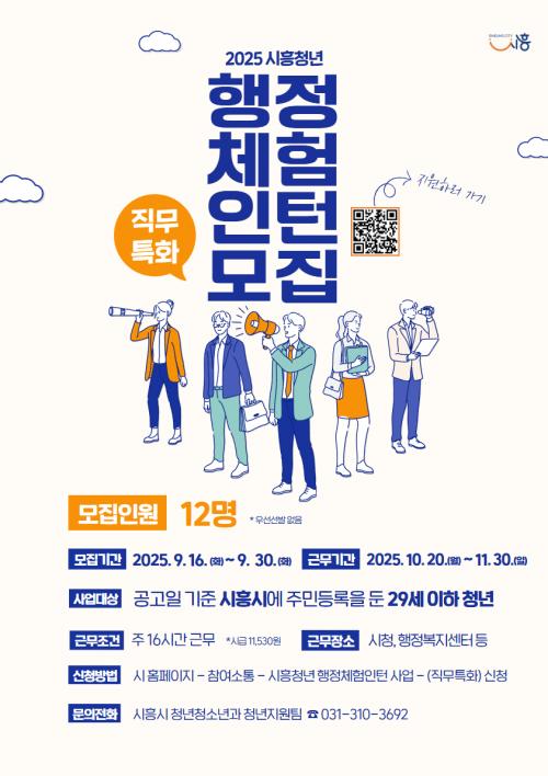 [½Åµ¿¾Æ¹æ¼Û ½ÃÈï½Ã=À̽ŵ¿±âÀÚ] ½ÃÈï½Ã´Â 2025³â (Á÷¹«Æ¯È­) ÇϹݱâ ÇàÁ¤Ã¼Çè ÀÎÅÏ »ç¾÷À» 10¿ù 20ÀϺÎÅÍ 11¿ù 30ÀϱîÁö 6ÁÖ°£ ÃßÁøÇÑ´Ù. Á÷¹«Æ¯È­ ÇàÁ¤Ã¼Çè ÀÎÅÏ »ç¾÷Àº ½ÃÈï½Ã¿¡ Áֹεî·ÏÀ» µÐ 29¼¼ ÀÌÇÏ Ã»³âÀ̶ó¸é ´©±¸³ª Áö¿øÇÒ ¼ö ÀÖ´Ù. ½Åû±â°£Àº 9¿ù 16ÀϺΡ¦