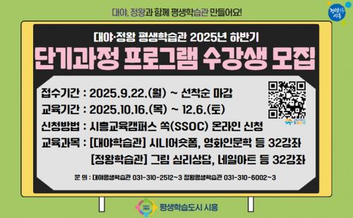 [½Åµ¿¾Æ¹æ¼Û ½ÃÈï½Ã=À̽ŵ¿±âÀÚ] ½ÃÈï½Ã ´ë¾ß ¡¤ Á¤¿ÕÆò»ýÇнÀ°üÀº ¿À´Â 9¿ù 22ÀϺÎÅÍ 2025³âµµ ÇϹݱ⠴ܱâ°úÁ¤ Æò»ýÇнÀ ÇÁ·Î±×·¥ ¼ö°­»ý ¸ðÁýÀ» ½ÃÀÛÇÑ´Ù. ÇÁ·Î±×·¥Àº 10¿ù 16ÀϺÎÅÍ 12¿ù 6ÀϱîÁö ¾à µÎ ´Þ°£ ¿î¿µµÉ ¿¹Á¤ÀÌ´Ù. À̹ø ÇÁ·Î±×·¥Àº Âü¿©Çü ½Ã¹Î Á¦¾È ÇÁ·Î¡¦