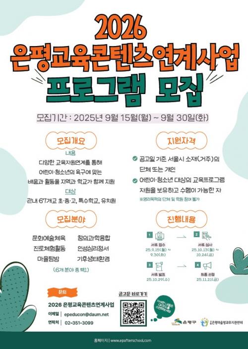 [½Åµ¿¾Æ¹æ¼Û ÀºÆò±¸=À̽ŵ¿±âÀÚ] ¼­¿ï ÀºÆò±¸´Â ¿À´Â 30ÀϱîÁö ¡®2026³â ÀºÆò±³À°ÄÜÅÙÃ÷ ¿¬°è»ç¾÷¡¯ ÇÁ·Î±×·¥À» ¸ðÁýÇÑ´Ù°í ¹àÇû´Ù. ±¸´Â À̹ø °ø¸ð¸¦ ÅëÇØ Çб³ ±³À°°úÁ¤ ¹× ¹æ°úÈÄ È°µ¿°ú ¿¬°è°¡ °¡´ÉÇÑ ´Ù¾çÇÑ ±³À° ÇÁ·Î±×·¥À» ¹ß±¼ÇÏ°í ¾Æµ¿¡¤Ã»¼Ò³â¿¡°Ô Æø³ÐÀº¡¦