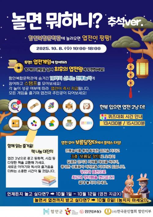 [½Åµ¿¾Æ¹æ¼Û °æ³²ÇÔ¾È=À̽ŵ¿±âÀÚ] ÇԾȱºÀº Ãß¼®À» ¸Â¾Æ ÇԾȺ¹ÇÕ¹®ÇаüÀ» ã´Â °ü¶÷°´µéÀÌ ÀüÅë³îÀÌ Ã¼ÇèÀ» ÅëÇØ ÀüÅ빮ȭ¿Í ¹®ÇÐ, ÇÑÇÐÀÇ Àǹ̸¦ µÇ»õ±æ ¼ö ÀÖµµ·Ï Ãß¼®¸ÂÀÌ ÀüÅë³îÀ̸¶´çÀ» 10¿ù 1ÀϺÎÅÍ 12ÀϱîÁö ¿î¿µÇÑ´Ù°í ¹àÇû´Ù. ƯÈ÷ 10¿ù 8ÀÏ ¿ÀÀü 10½ÃºÎ¡¦