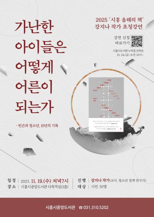 [½Åµ¿¾Æ¹æ¼Û ½ÃÈï½Ã=À̽ŵ¿±âÀÚ] ½ÃÈï½Ã Áß¾Óµµ¼­°üÀº ¡®2025³â ½ÃÈï ¿ÃÇØÀÇ Ã¥¡¯À¸·Î ¼±Á¤µÈ ¡¸°¡³­ÇÑ ¾ÆÀ̵éÀº ¾î¶»°Ô ¾î¸¥ÀÌ µÇ´Â°¡¡¹ÀÇ ÀúÀÚ °­Áö³ª ÀÛ°¡¸¦ ÃÊÃ»ÇØ 11¿ù 19ÀÏ ¿ÀÈÄ 7½Ã Áß¾Óµµ¼­°ü 3Ãþ ´Ù¸ñÀû½Ç¿¡¼­ ½Ã¹Î °­¿¬È¸¸¦ °³ÃÖÇÑ´Ù. À̹ø °­¿¬Àº ¡®½ÃÈï ¡¦