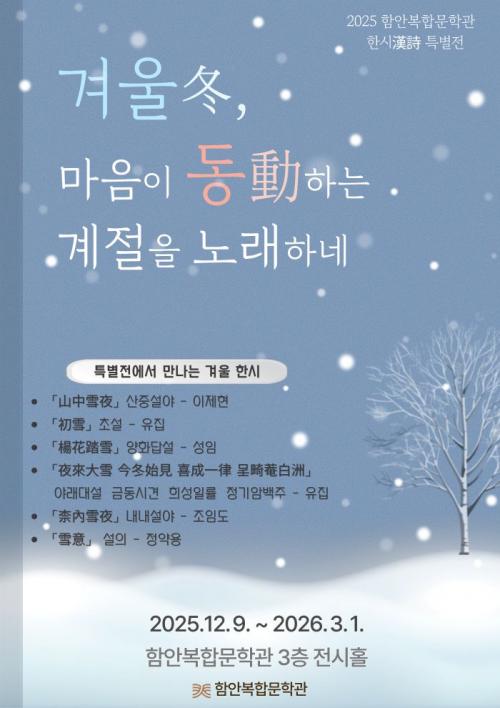 [½Åµ¿¾Æ¹æ¼Û °æ³²ÇÔ¾È=À̽ŵ¿±âÀÚ] ÇԾȱºÀº 12¿ù 9ÀϺÎÅÍ 2026³â 3¿ù 1ÀϱîÁö ÇԾȺ¹ÇÕ¹®Çаü 3Ãþ Àü½ÃȦ¿¡¼­ 2025 ÇѽÃ(ùÓãÌ) Ưº°Àü ¡®°Ü¿ï(ÔÏ), ¸¶À½ÀÌ µ¿(ÔÑ)ÇÏ´Â °èÀýÀ» ³ë·¡Çϳס¯¸¦ °³ÃÖÇÑ´Ù°í ¹àÇû´Ù. À̹ø Ưº°ÀüÀº °Ü¿ïÀ» ÁÖÁ¦·Î ÇÑ Çѽø¦ Á·ÀÚ ÇüÅ·Π¡¦